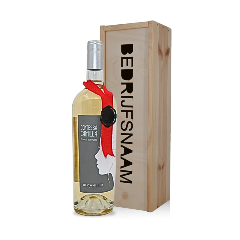 Pinot grigio, witte wijn in kist met bedrijfsnaam
