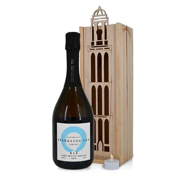 Deze mooie 0,0% Sparkling Tea uit Kopenhagen zorgt voor een bijzondere alcoholvrije 'champagnebeleving' en is verpakt in een unieke Peperbus-kist, met als optie een extra gravure van eigen logo of tekst naar keuze.