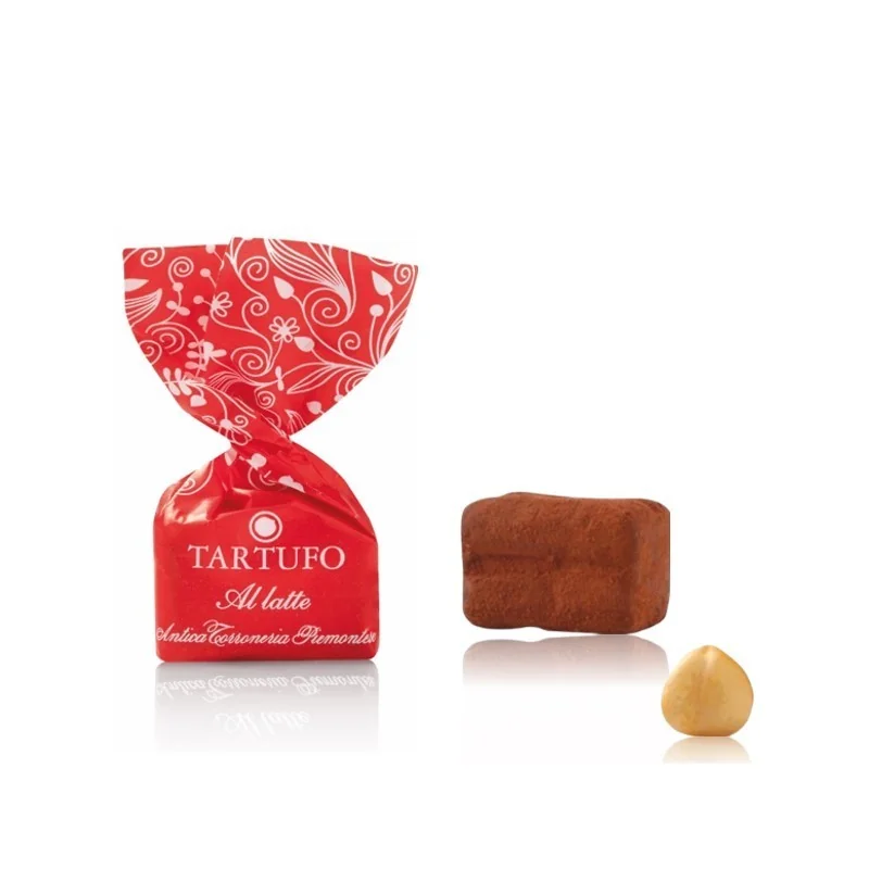 Een melkchocoladetruffel met stukjes van IGP hazelnoten uit Piemonte en bestrooid met cacaopoeder, verpakt in felrood papier