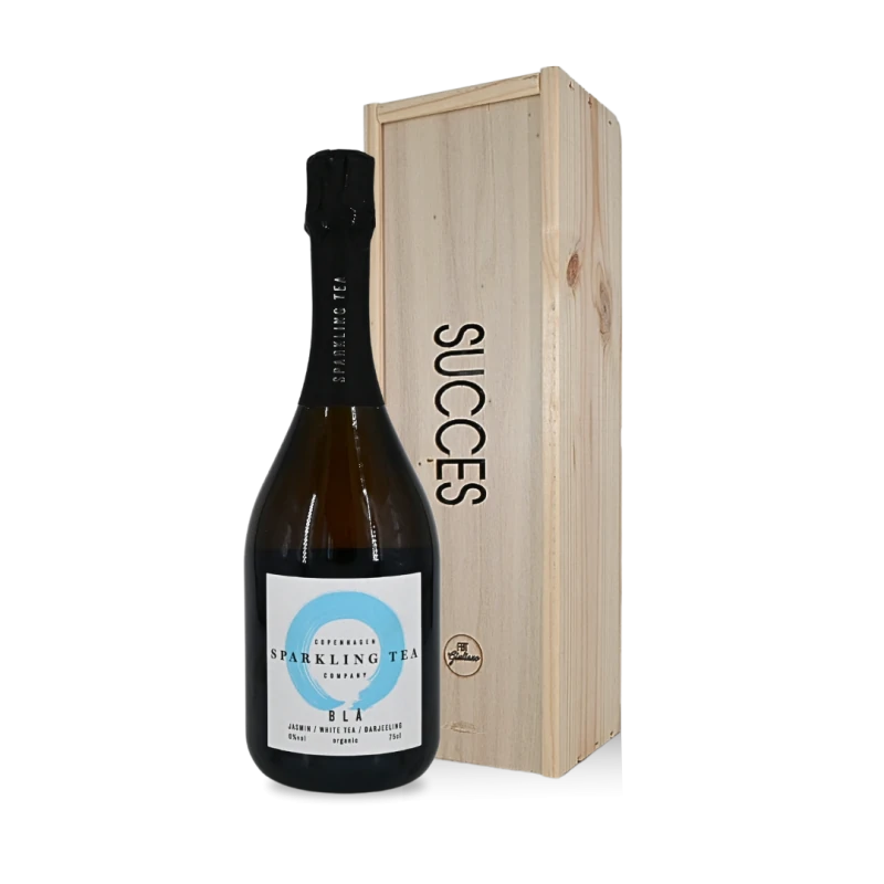Een bruisende 0,0% Sparkling Tea met standaard gravure SUCCES op de wijnkist, met als optie een aanvullende gravure met een persoonlijke boodschap, logo, etc.