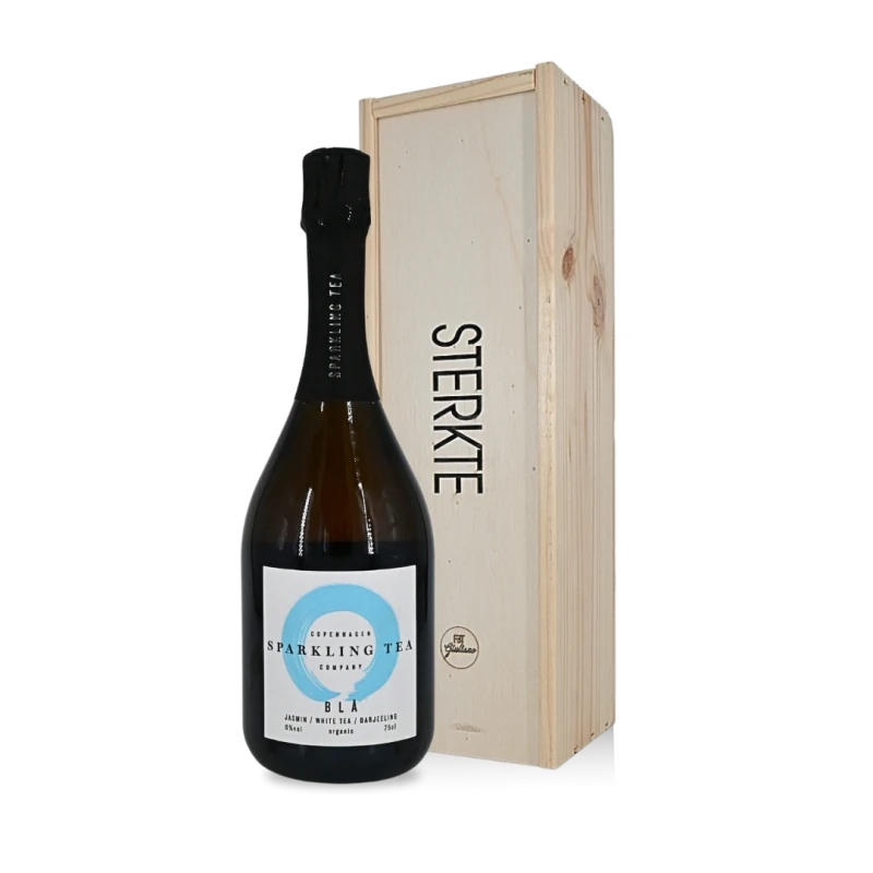 Een bruisende 0,0% Sparkling Tea met standaard gravure STERKTE op de wijnkist, met als optie een aanvullende gravure met een persoonlijke boodschap, logo, etc.