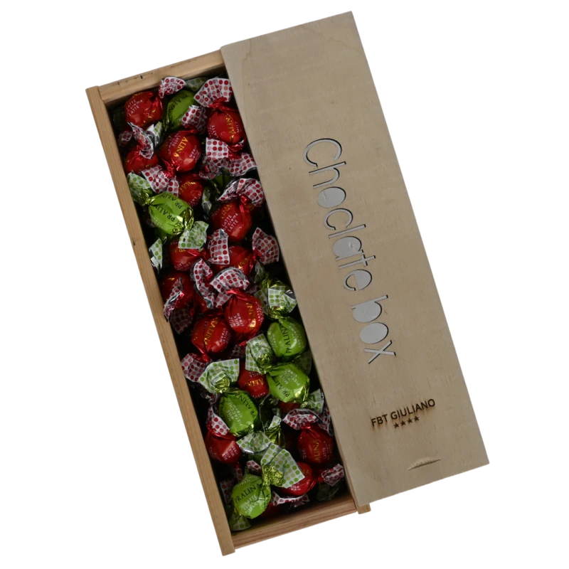 Het houten geschenkenkistje is door-en-door gegraveerd met de tekst "CHOCLATEBOX" en voorzien van 1 kg chocolade in de vorm van pralines van het Italiaanse merk Di Gennaro.