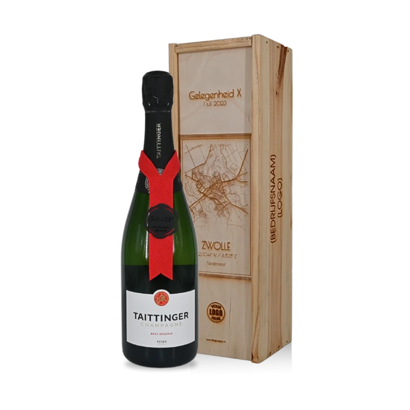 De gravure op het houten wijnkistje wordt voorzien van de geografische coördinaten en van eigen tekst en logo.