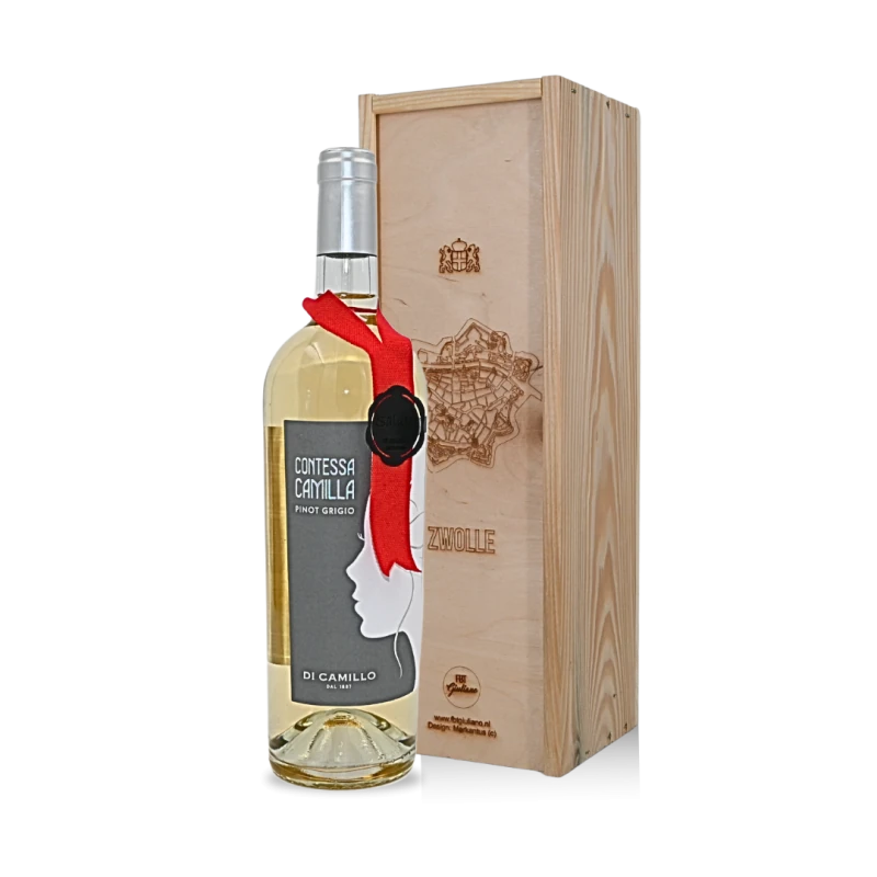 Pinot grigio witte wijn in kist met Zwolle kunstgravure