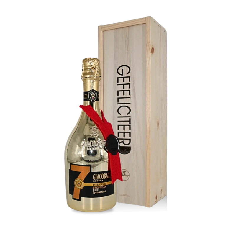 Een bruisende prosecco in met standaard gravure GEFELICITEERD op de wijnkist, met als optie een aanvullende gravure met een persoonlijke boodschap, logo, etc.