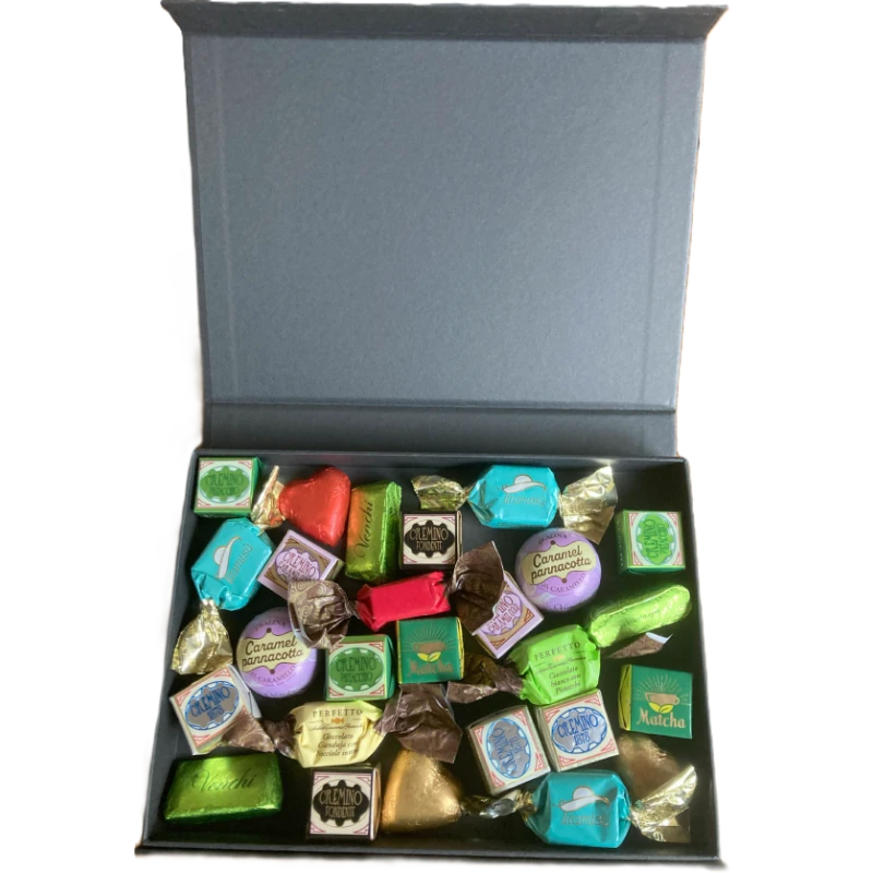 Ons brievenbuspakket bestaat uit een gegraveerde luxe zwarte box voorzien van ca 30 heerlijke Venchi Italiaanse kwaliteitsbonbons.