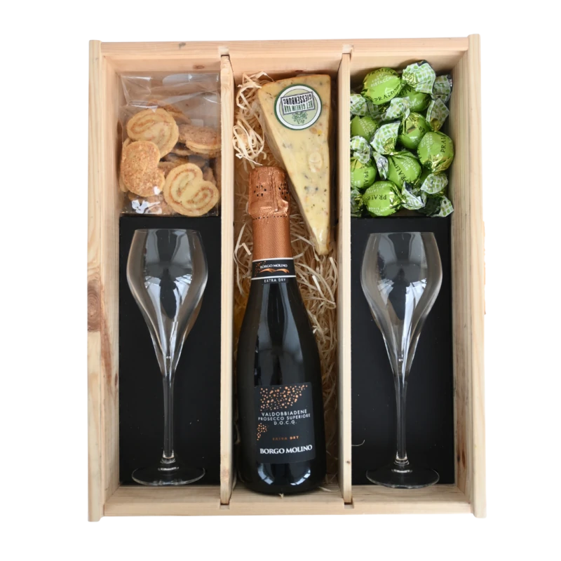 Dit borrelpakket i verpakt in een sfeervolle houten kist en bestaat uit een flesje prosecco (375 ml), een kaasje, luxe kaasvlinders en heerlijke Venchi pistache truffelbonbons.