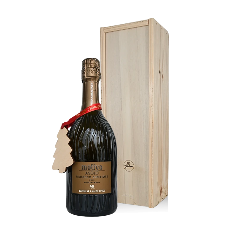 Sfeervol pakket met een prachtige fles prosecco, voorzien van een gratis te graveren houten kerstlabel.