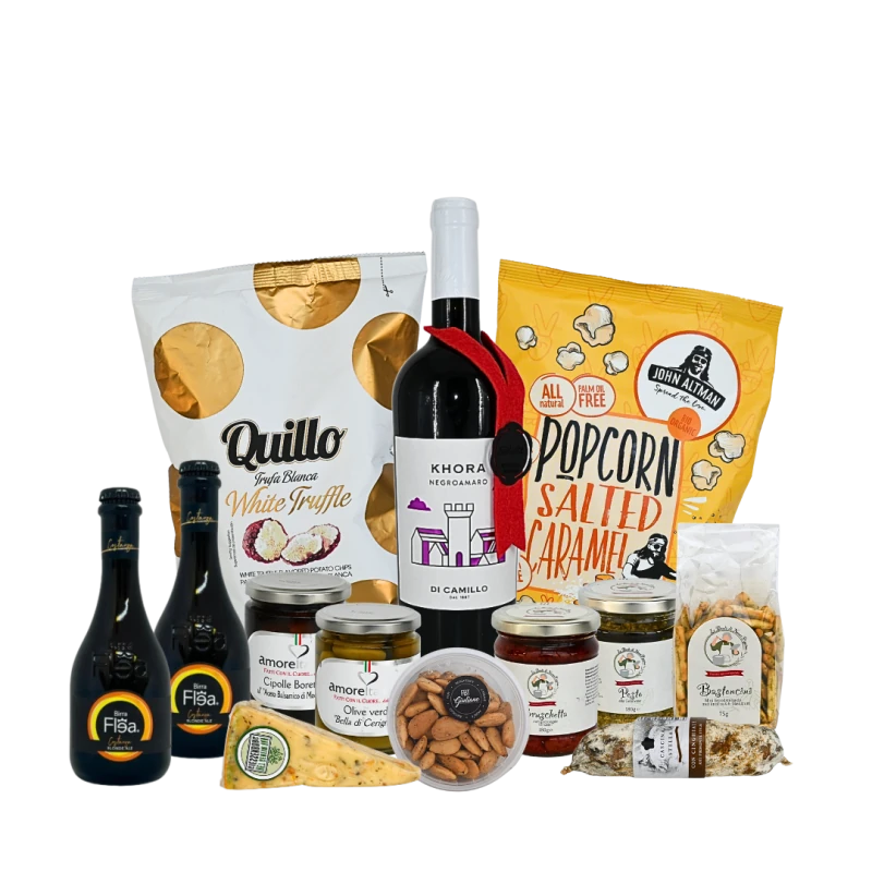 Gevarieerd en uitgebreid borrel en delicatessenpakket met pure producten en smaken uit Italië. Waaronder een mooie rode wijn fles Negroamaro uit Puglia, Italiaanse blond biertjes en andere lekkernijen!