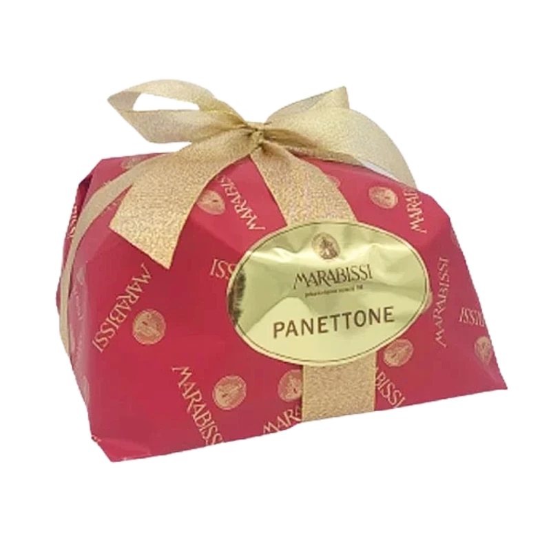 Prachtige ambachtelijke panettone (850gram) met chocolade van Marabissi, verpakt in donkerrood papier met goudkleurige details en strik.