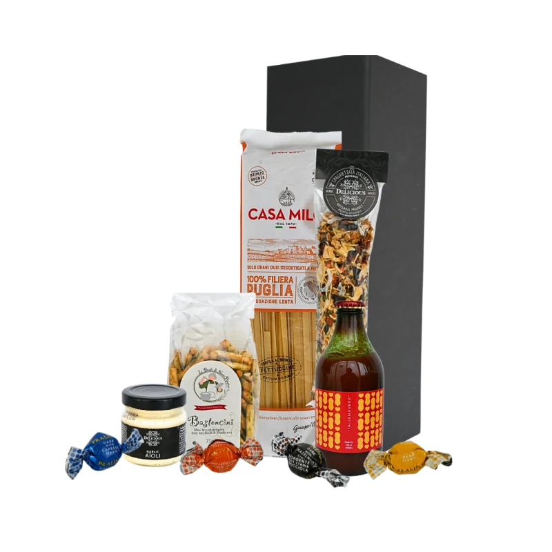 Heerlijk Italiaans pasta pakket met toastjes, aioli en vier heerlijke Italiaanse pralines.