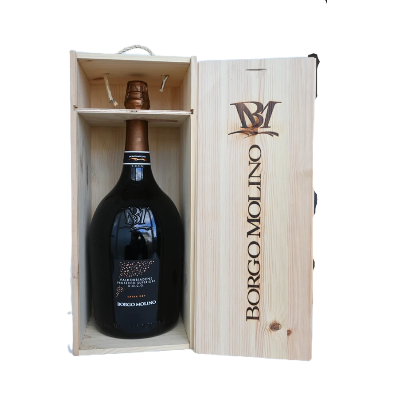Prachtige houten kist met een imponerende fles Prosecco Valddobbiadene Jeroboam 3 ltr Borgo Molino.