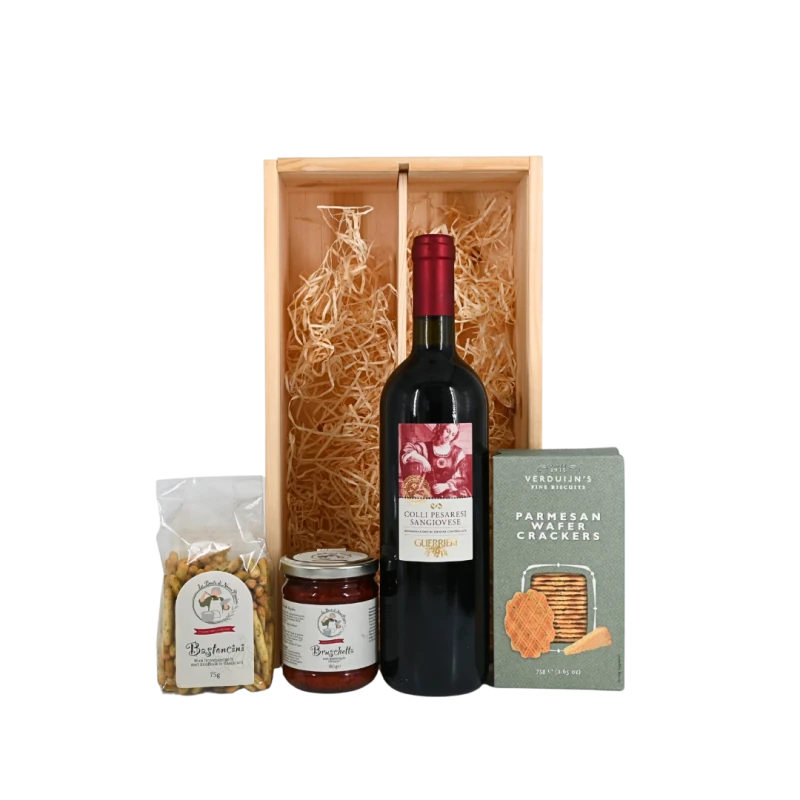 Dit pakket Sienna is een heerlijk borrelpakket bestaande uit een mooie SANGOISE rode wijn uit Italië met borrelhapjes, verpakt in een houten wijnkist.