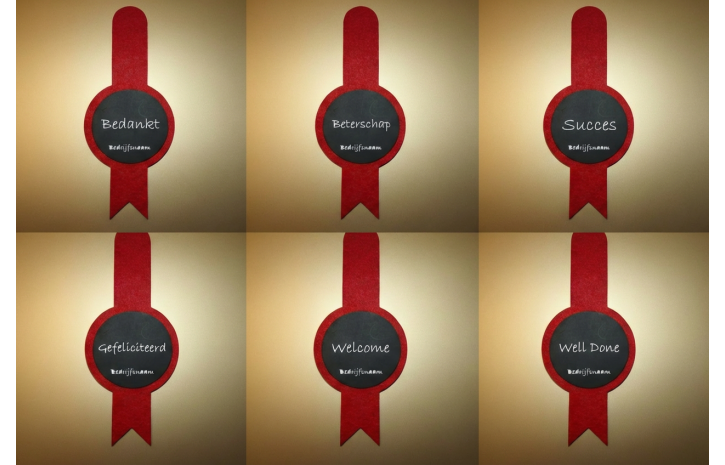 - Huisstijl fleslabels gegraveerd met de boodschap: BEDANKT-SUCCES-WELCOME-WELLDONE-BETERSCHAP-GEFELICITEERD