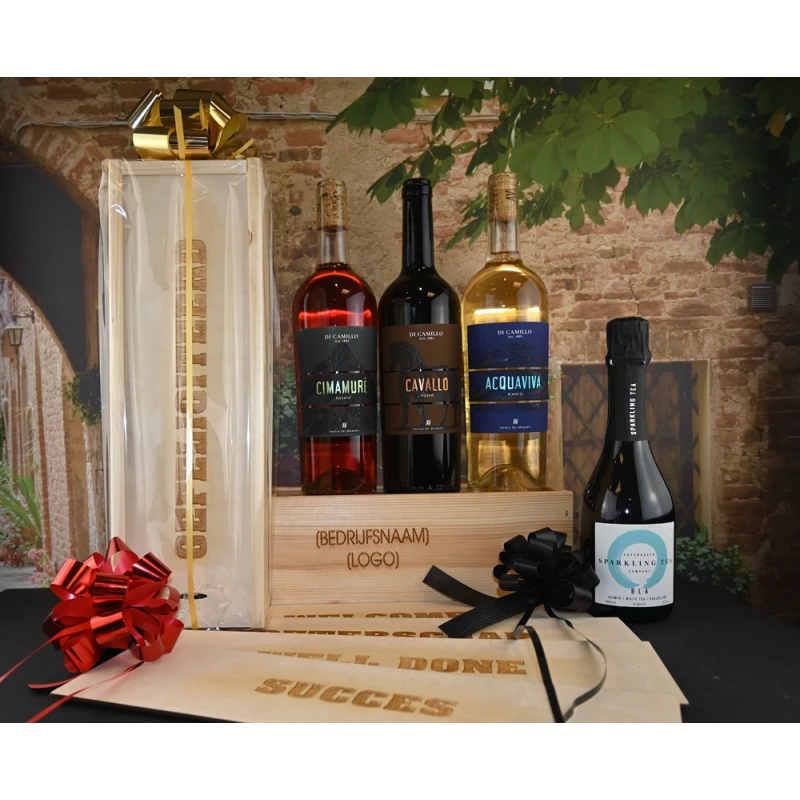 Deze toolbox bestaat uit een complete set aan geschenkflessen, inpakmateriaal, gegraveerde wijnkistjes in eigen huisstijl en met verwisselbare gegraveerde deksels met de boodschap (BEDANKT-GEFELICITEERD-SUCCES-BETERSCHAP-WELCOME-WELL DONE).