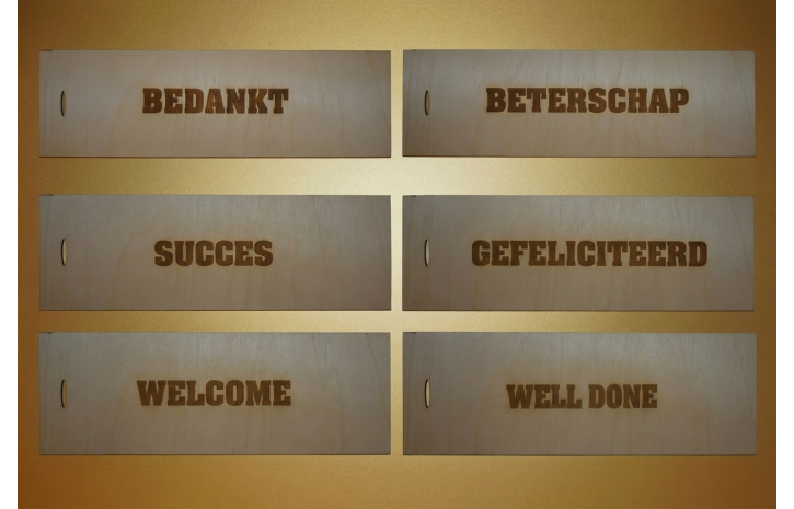 - Gegraveerde deksels naar keuze: BEDANKT-SUCCES-WELCOME-WELLDONE-BETERSCHAP-GEFELICITEERD
