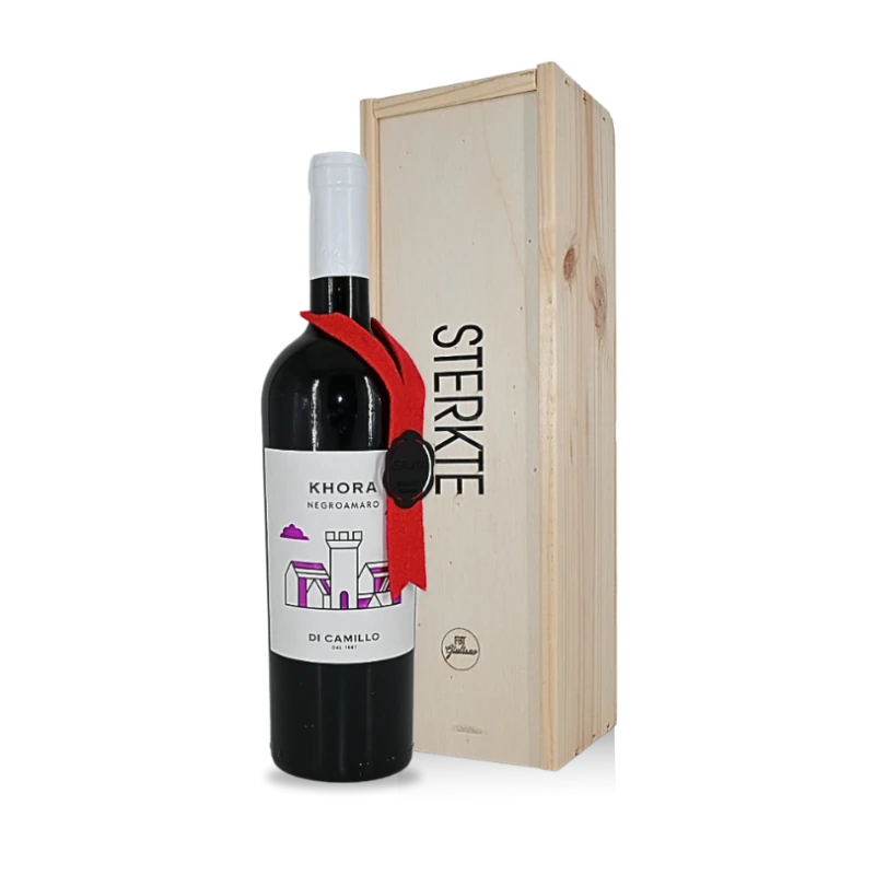 Een heerlijke Italiaanse rode wijn uit Puglia met standaard gravure STERKTE op de wijnkist, met als optie een aanvullende gravure met een persoonlijke boodschap, logo, etc.