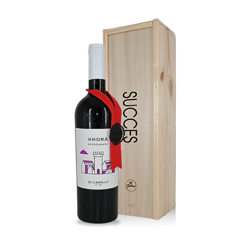 Een heerlijke Italiaanse rode wijn uit Puglia met standaard gravure SUCCES op de wijnkist, met als optie een aanvullende gravure met een persoonlijke boodschap, logo, etc.