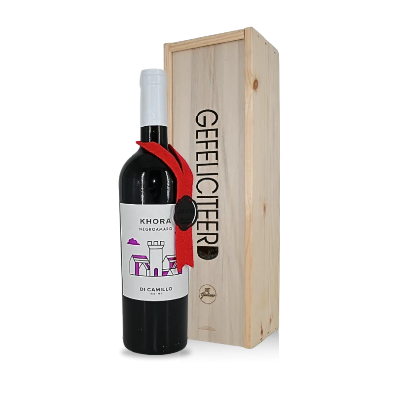 Een heerlijke Italiaanse rode wijn uit Puglia met standaard gravure GEFELICITEERD op de wijnkist, met als optie een aanvullende gravure met een persoonlijke boodschap, logo, etc.