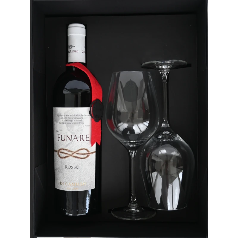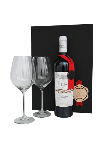 Prachtig geschenk bestaande uit een mooie fles rode wijn en 2 Itallesse Calice wijnglazen met als optie deze te laten graveren met eigen initialen of logo.