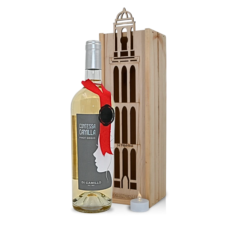 Een heerlijke Italiaanse witte Pinot Grigio uit Zuid Italië verpakt in een unieke Peperbus-kist, met als optie een extra gravure van eigen logo of tekst naar keuze.