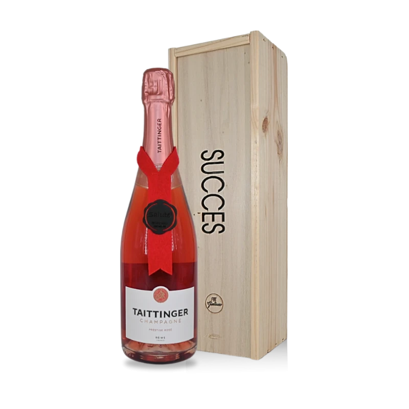 Prachtige Taittinger Rosé Prestige Champagne uit Reims, met standaard gravure SUCCES op de wijnkist, met als optie een aanvullende gravure met een persoonlijke boodschap, logo, etc.